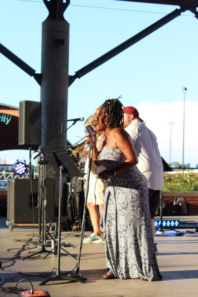 The headliner, The Dizzy 7, is a jazz band made up of seven guys. Three of the members play horns: trumpet, saxophone, and trombone, while the rest of the band is made up of the rhythm section. The lead singer, Genine Latrice Perez, had an amazing voice that beautifully hit every note. She also has a solo career with a few EPs, her most recent being “I AM” released in 2020. The band covered newer songs like “Back to Black” by Amy Winehouse and “Skyfall” by Adele. While they performed their own renditions of these contemporary songs, they also played classic songs such as Aretha Franklin’s “Say a Little Prayer for You,” which allowed the music to cater to all demographics.